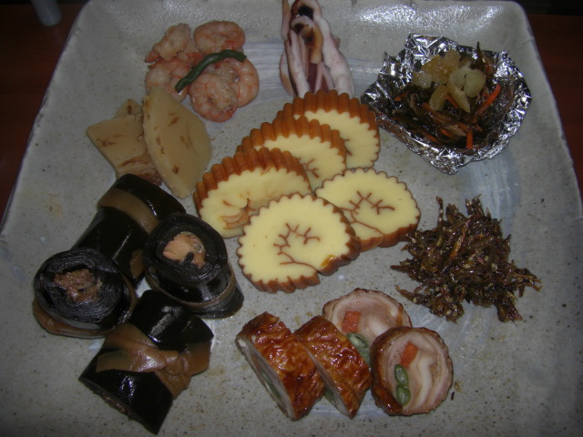 作ったっていうか、スーパーで買ってきた伊達巻きやニシン巻きなんかを盛りつけただけなんだけど。(笑)