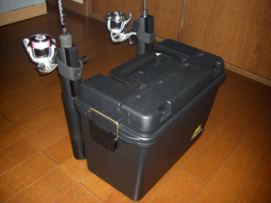 HIRO兄ぃとロッドスタンド付きタックルボックスについて話をしている時に、一番悩んでいたのが、転倒防止用の脚だったんですが、ロッドスタンド部がそのまま転倒防止の役割をするんではないかと思って、とりあえず装着は見送りました。